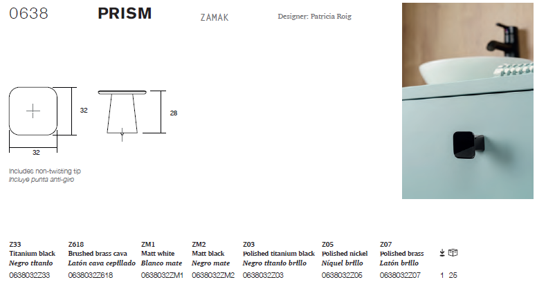 Prism 是一款方形、優雅且實用的鋅合金旋鈕,單指握持舒適。鈍形底座與纖細的正面形成鮮明對比,賦予其獨特的個性,使其在眾多旋鈕中脫穎而出。 Prism 提供七種飾面可選:鈦黑、拉絲黃銅、霧面白、消光黑、拋光鈦黑、拋光鎳和拋光黃銅,是一款用途廣泛的設計,能夠優雅地融入各種環境。此外,它還配備了防旋轉旋鈕頭。