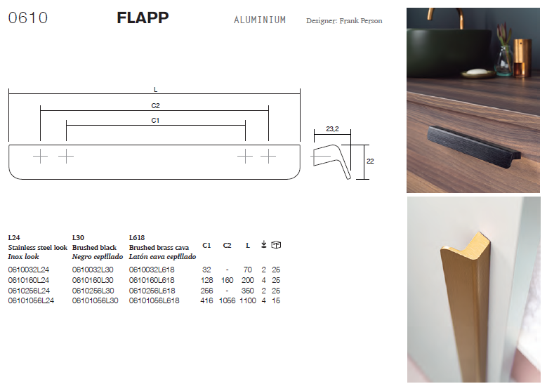 這是一款非常實用且符合人體工學的手把。直線與圓潤邊緣的融合使 Flapp Aluminium 成為一款散發著優雅氣息並時尚地融入任何環境的配件。1100mm 長的規格非常適合現代廚房和大型更衣室,它能夠增強每個空間的獨特性。在同一環境中將小尺寸與長尺寸結合起來,或在垂直或水平位置上使用它,充分發揮其卓越的裝飾潛力。