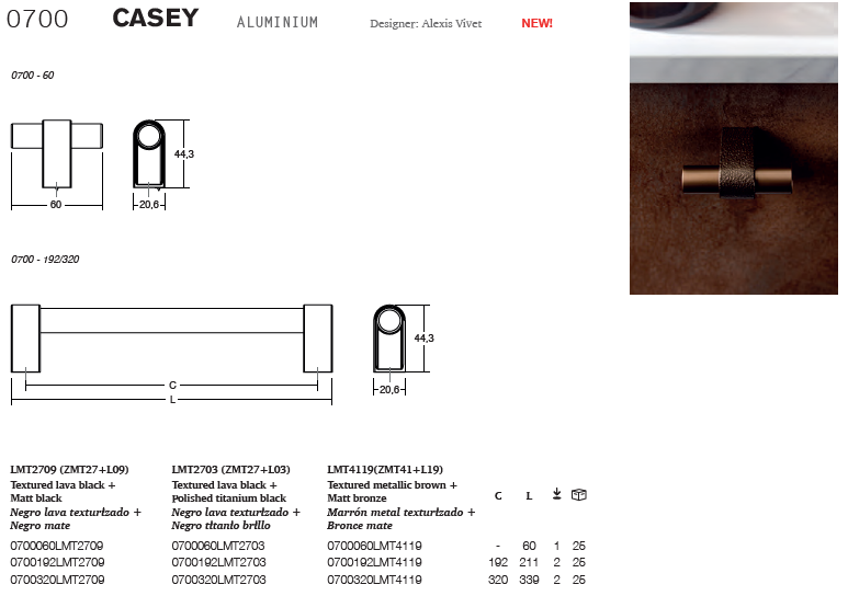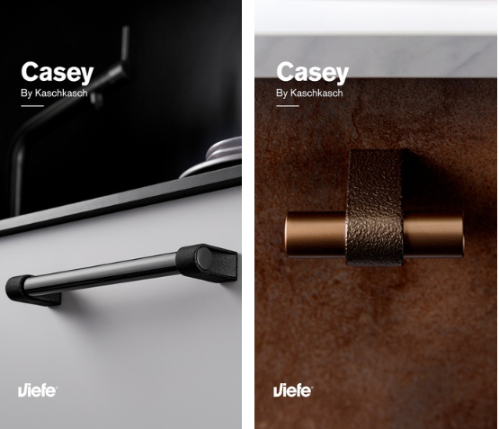 Casey 鋁製把手堅固而精緻的設計,搭配一系列創新且引領潮流的色澤,成為了現代工業美學中的新時尚,可完美適用於工業風廚房和家具。Casey提供優雅的紋理組合:紋理熔岩黑+霧面黑;紋理熔岩黑+拋光鈦黑;以及紋理金屬棕+霧面青銅。這些選擇為追求獨特魅力的室內設計項目增添了精緻感,使中性飾面的門板透過醒目的對比脫穎而出。