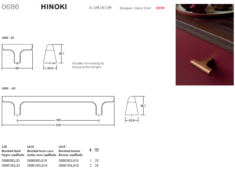 Hinoki 把手以其均衡的造型和簡約的設計風格而聞名。它堅固輕巧,優雅實用,光滑的質地和充滿亞洲風格的輪廓設計,帶來格外舒適的握感。精緻的設計使其成為高端室內設計的理想之選,滿足客戶對個性與品質的追求。這款把手提供 60mm 和 220mm(160CC)兩種尺寸,可輕鬆適配小型家具以及大型衣櫃門,並在裝飾元素之間形成視覺上的連貫性。旋鈕式把手採用防旋轉設計,確保穩固性。