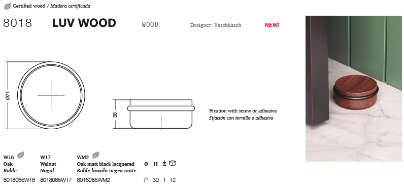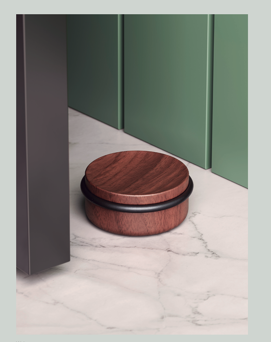 Luv Wood 門擋採用經認證過的原產木材製成,是一款標誌性的設計元素。其頂部略為凹陷,與地面接觸處邊緣圓潤,簡潔的線條和溫暖的質感,為空間增添北歐的簡約風格。 71 mm的直徑使其本身也可成為裝飾品。黑色防撞橡膠圈可有效保護門擋免受碰撞,適用於任何環境。與木質調和現代設計為主的空間完美契合。