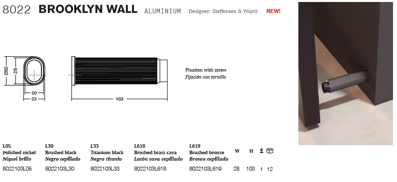 Brooklyn Wall 門擋巧妙融合了優雅與工業質感,垂直線條的設計更賦予其引人注目的視覺衝擊。這款門擋經久耐用且功能齊全,提供多種飾面選擇,能夠完美融入各種空間,並與整體設計風格和諧統一。黑色防撞橡膠圈可有效保護門擋免受各種環境下的碰撞。
