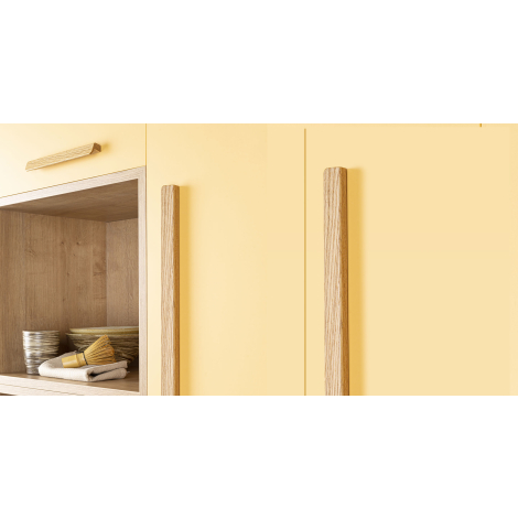 這是一款非常實用且符合人體工學的手把。目前室內設計界流行的木材給人一種非凡的溫暖感,直線與圓邊的融合使Flapp成為一款非常令人愉悅的配件,散發著優雅的感覺,自然適合任何環境。1100 毫米長的規格使其成為市場上獨特的手柄,具有無限的裝飾可能性。當安裝到大尺寸的櫥櫃和衣櫃上時,它能夠增強每個空間的獨特性。橡木和胡桃木飾面與當前流行的家具顏色非常相關,形成非常有趣的對比。我們還應
